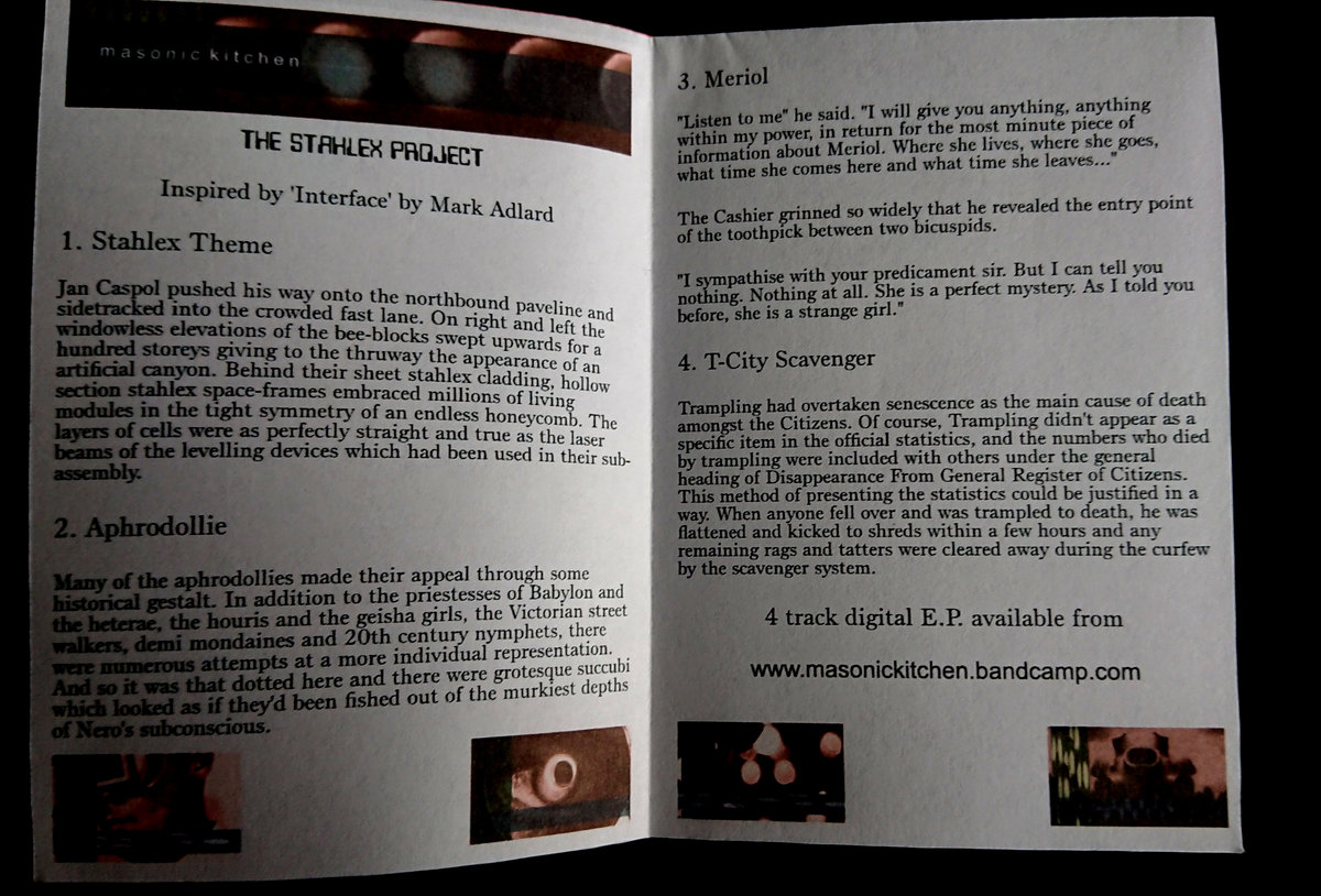 I only have a limited amount of these to sell, and each one will come with a 25mm Masonic Kitchen pin badge and leaflet with a facsimile of the cover of the original novel that inspired it along with selected quotes for each track.